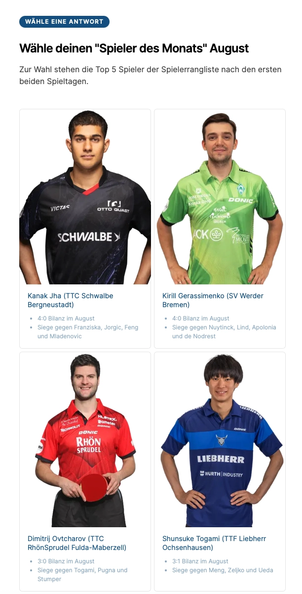 The single-select poll is great if you want to align players from each team in a column and ask people to simply click on a player image. The downside is that the fan does not immediately see who is currently at the top of the voting table when opening the poll.