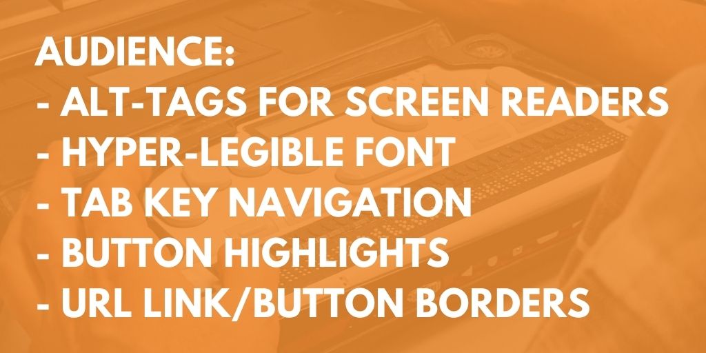 - Alt-tags – add descriptive text for screen readers to say aloud (visually impaired)