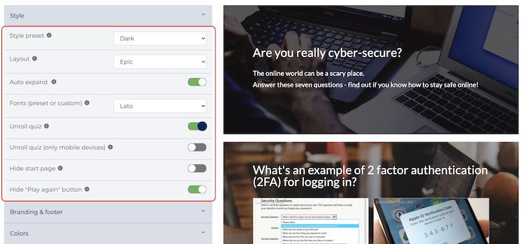 All our plans let you adjust the quiz colors, pick from 40 fonts, edit backgrounds and more – 60 customization options in all.